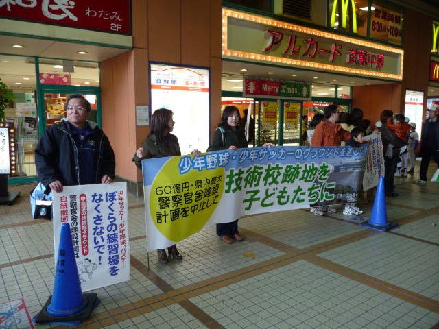 今年8月末で同校グラウンドが使えなくなって以降、初めての署名行動でしたが、あきらめるどころか、技術校を追い出された少年野球・サッカーチームと子どもたちは、練習場不足と不便を実感するなか、「なんとしても警察官舎建設をやめさせ、グラウンドの開放を再開させたい」という怒りと願いがさらに強まっていることを示しました。