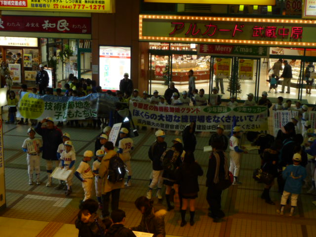 途中、少年野球チームOBの中学野球部員が「がんばれ」と激励していく場面も。中原駅前は「警察官舎よりもグラウンドの存続を」の熱気に包まれました。